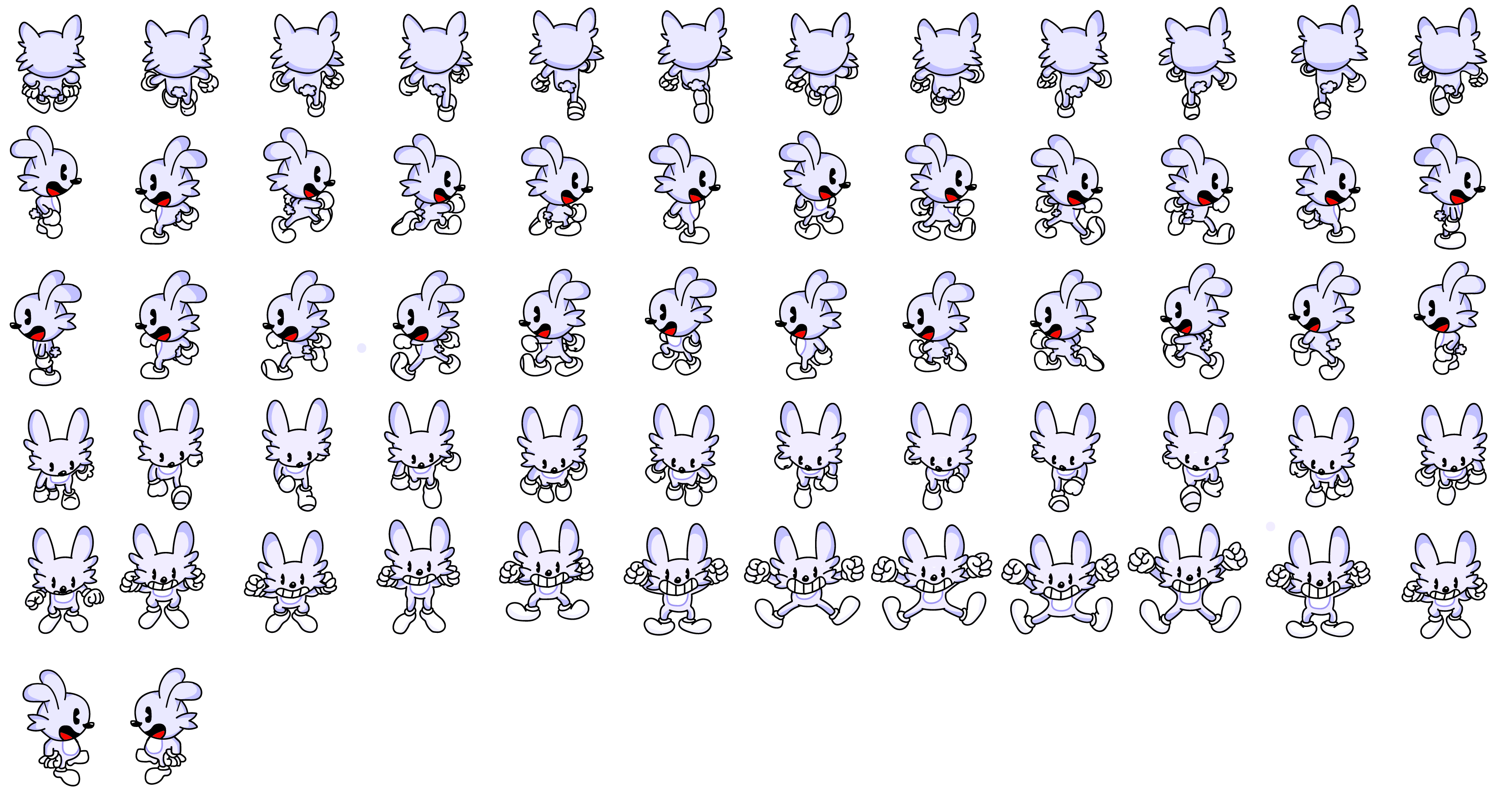This is the spritesheet I made in Illustrator then put it in photoshop. If you play the game you might notice that in this spritesheet, there is a victory animation. Sadly this didn't make it in the final cut due to time constraints.
