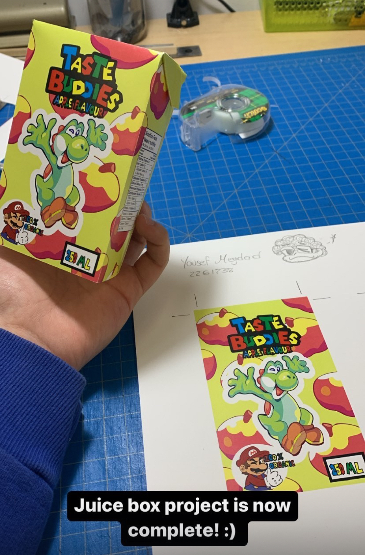 We had to make 3 Juice box designs and only print out 1. But since I liked my designs so much I printed all 3 of them. I made Yoshi fruit themed juice box designs with 3 different colored Yoshis and 3 flavor juices.