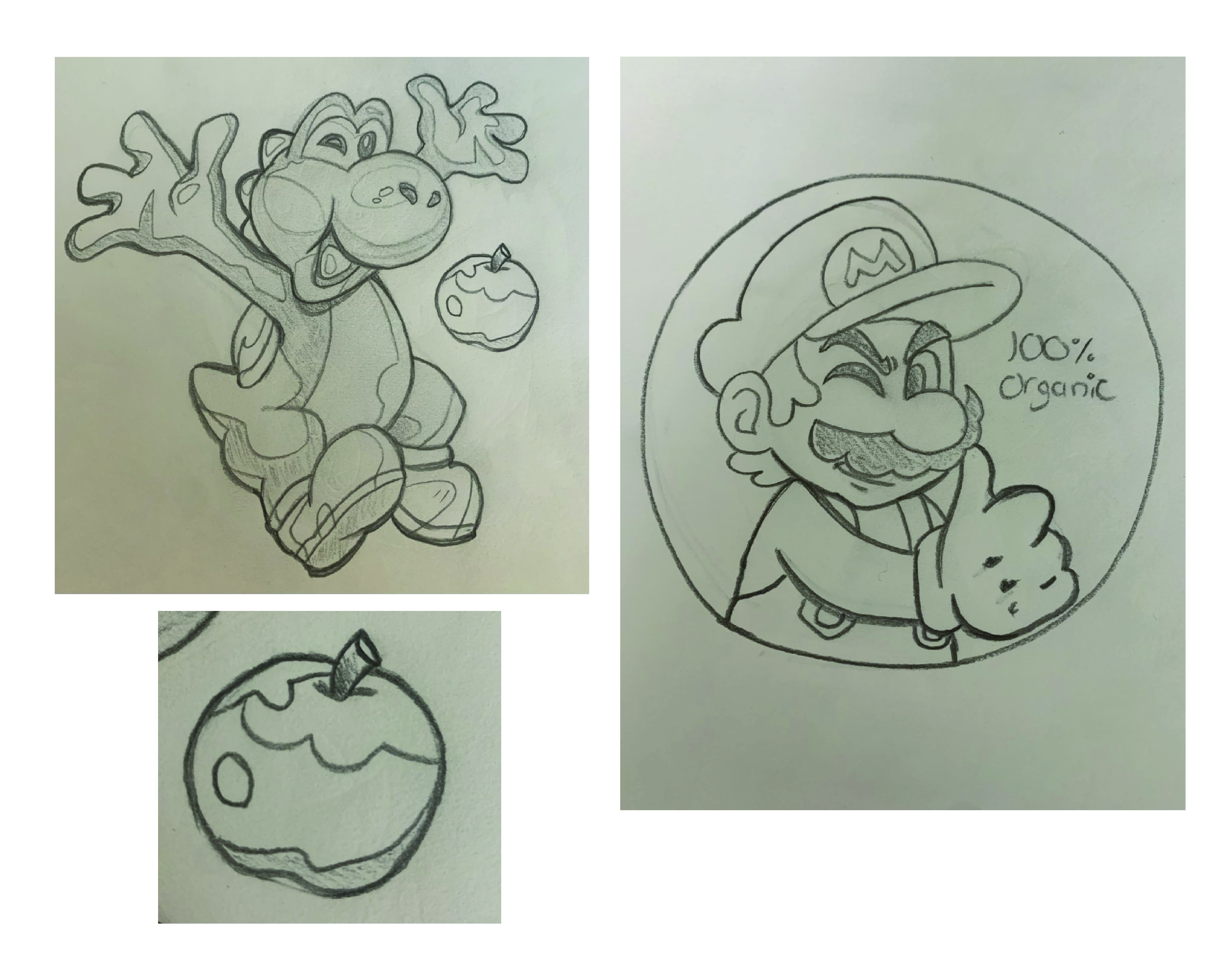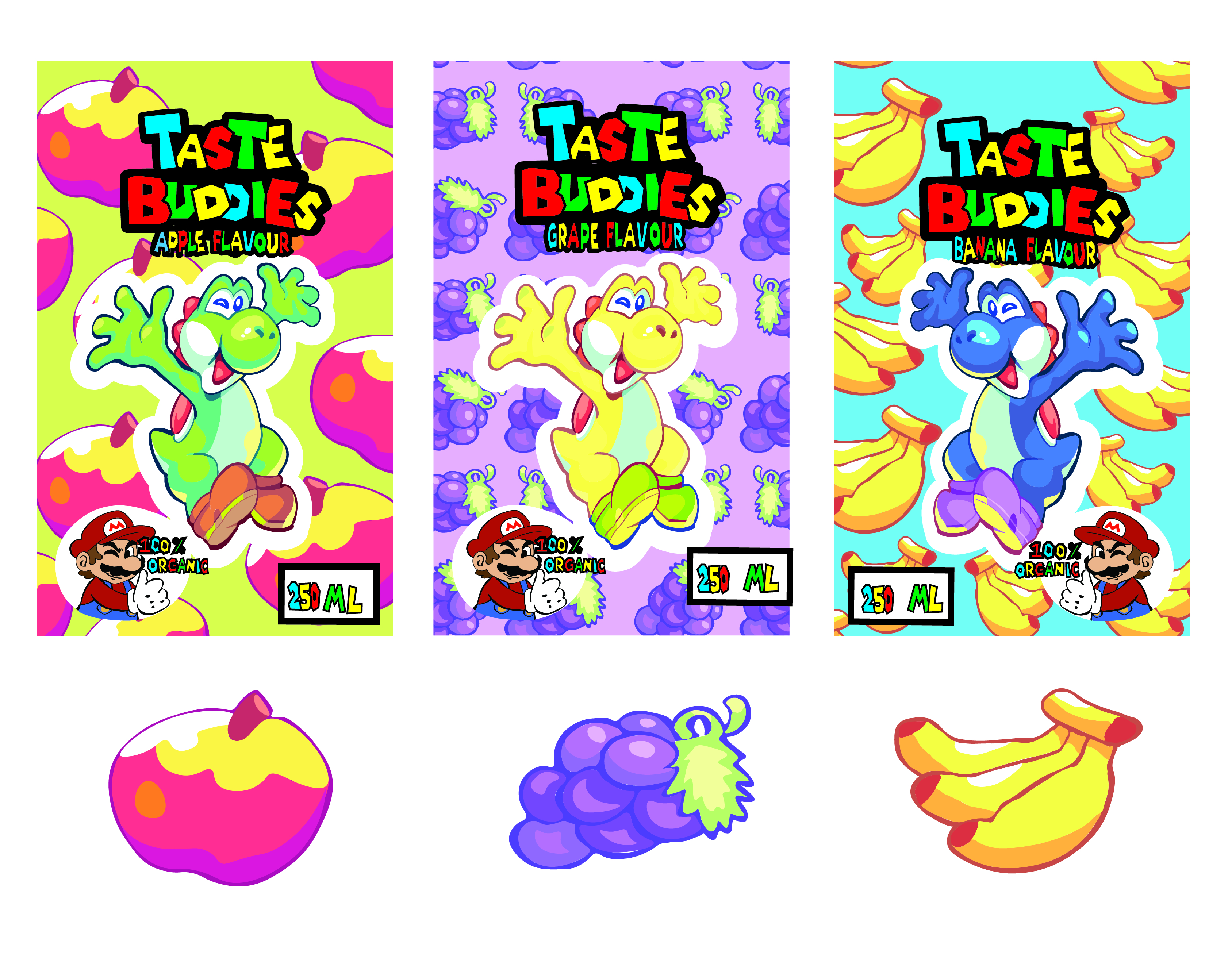 These are the final designs of the juice boxes. Instead of using the same green yoshi, I wanted to add different colors Yoshis that go with a fruit flavour. Note, I didn't make them the same color as the fruit they are assigned with because I feel like the box would be focused to much one 1 color so I wanted to make a color contrast with the yoshi and the fruit so It would pop more.