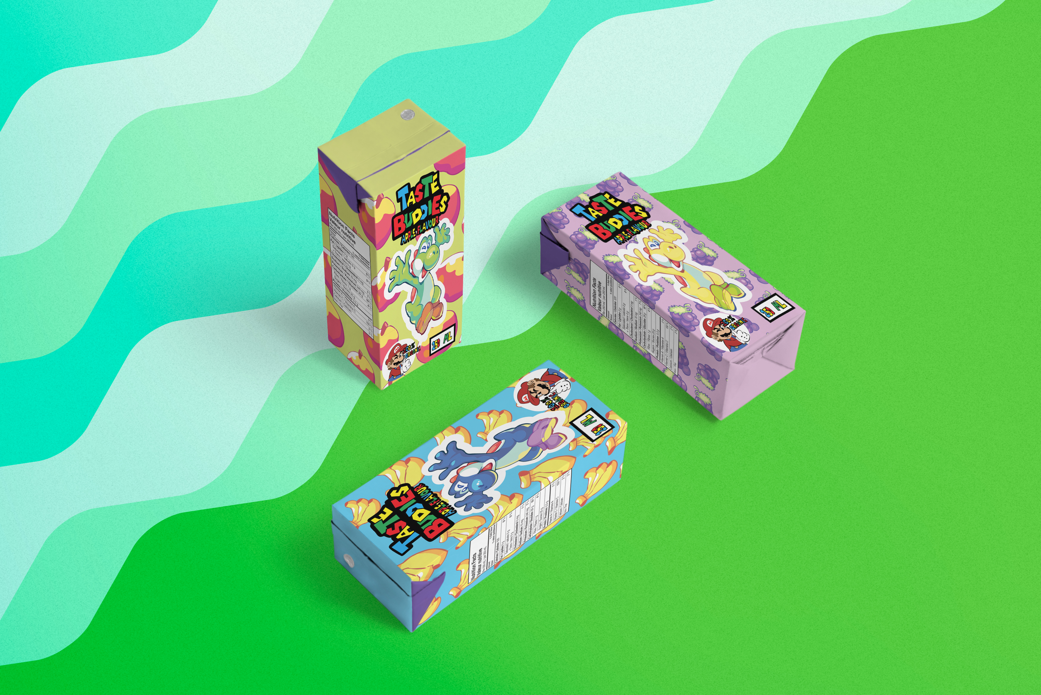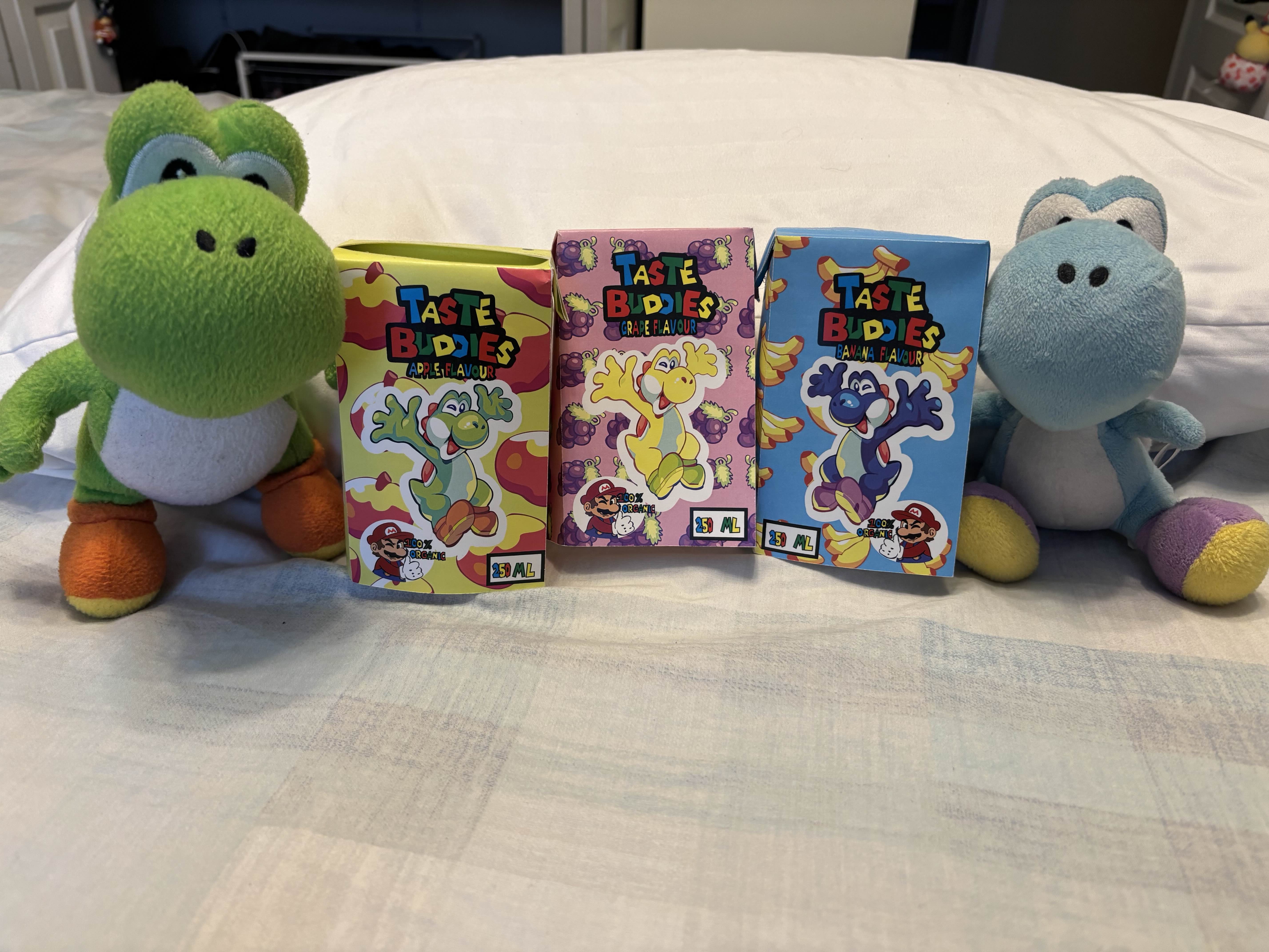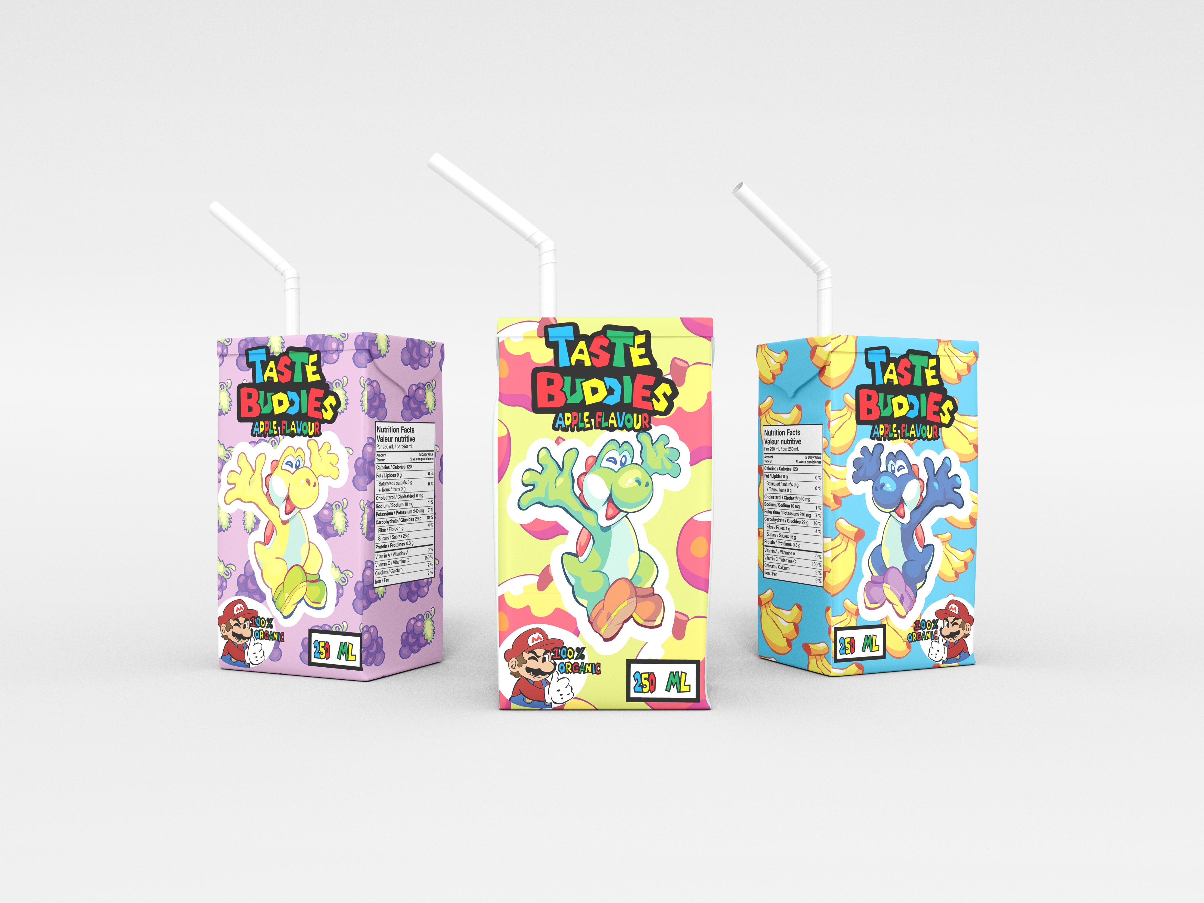 Here is a mockup of all 3 Yoshi Juice boxes designs together and some real life pictures of them physicaly.